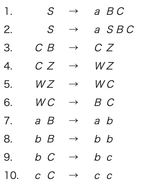 要は, 生成規則の矢印の左側に変数または終端文字が2つ以上並ぶ規則だったら, 文脈依存言語になる.