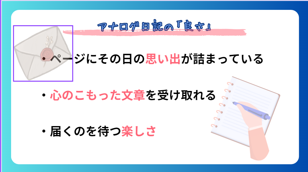 - LINEのように1日何通もやりとりできないので、1通にその日の思い出が詰まる。