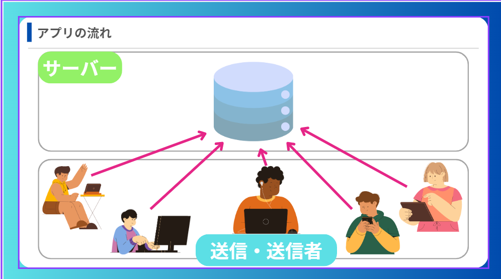 - frontend側からHTTPリクエストでバックエンドと通信→その内容を基にUIを更新