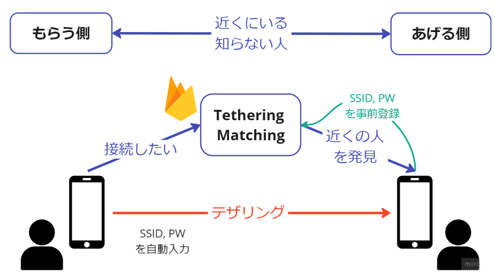 スマートフォンの基本機能であるテザリングを使って、知らない人の通信容量を借りて通信する仕組みを作成しました。