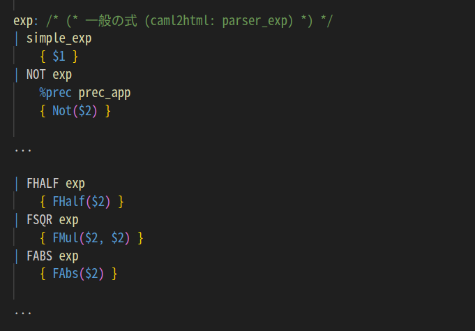 次に、parser.mlyでどのような構文になるかを定義(後ろに何が来るかなど)